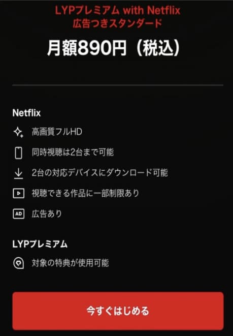 「LYPプレミアム with Netflix」は、上記の基本特典に加えて、Netflixの広告付きスタンダードプラン(月額890円相当)がセットになった新サービスです。